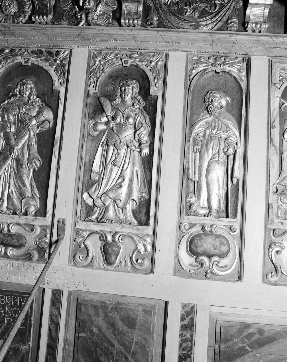 Soubassement du grand buffet, bas-reliefs sculptés et dorés, la Tempérance et saint Antoine l'Ermite.Immatriculation