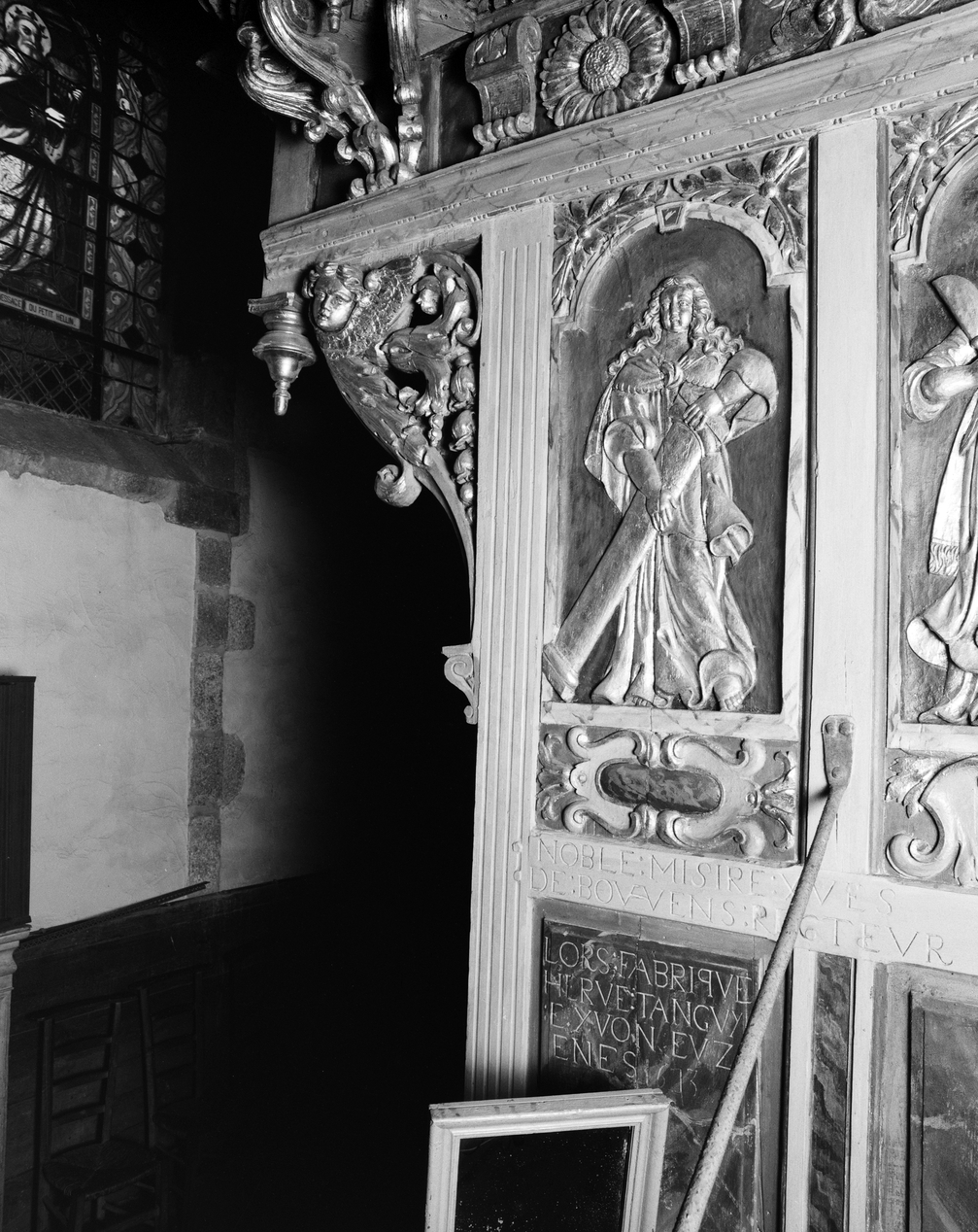 Soubassement du grand buffet, bas-reliefs sculptés et dorés, la Force.Immatriculation