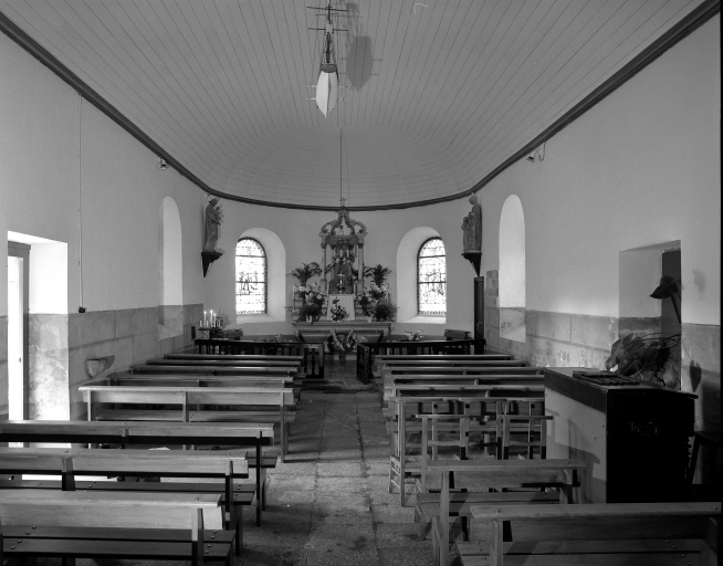 Plougoulm, chapelle de Notre-Dame de Prat-Coulm : intérieur, vue axiale vers le choeur, état en 1987Immatriculation