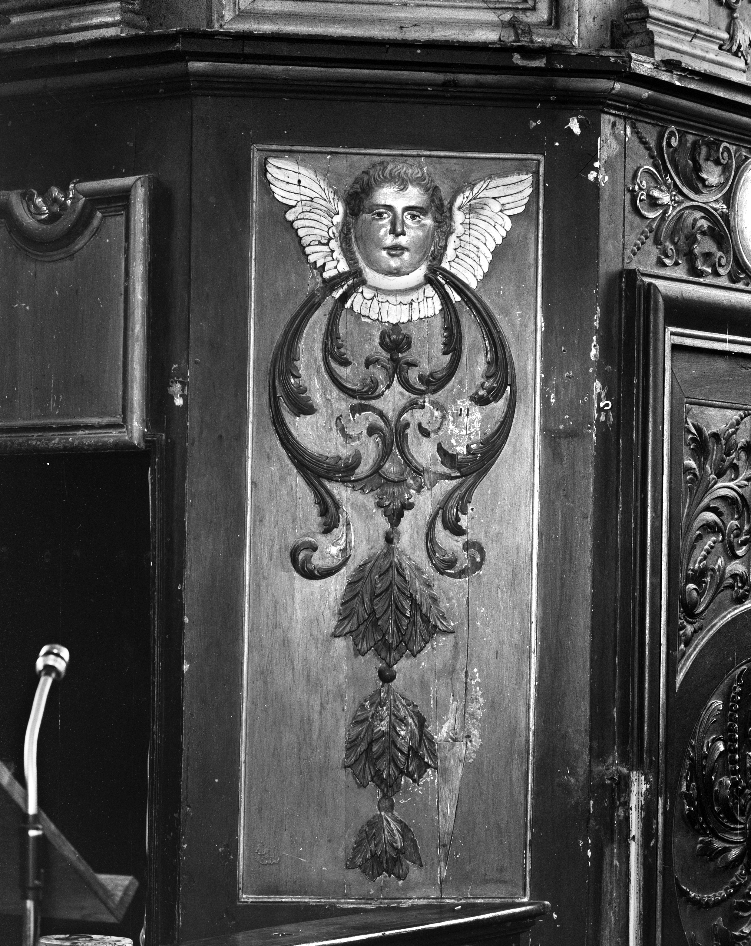 Choeur, angle nord-ouest, décor du panneau inférieur : angelot et chutes de feuilles (état en 1987)Immatriculation