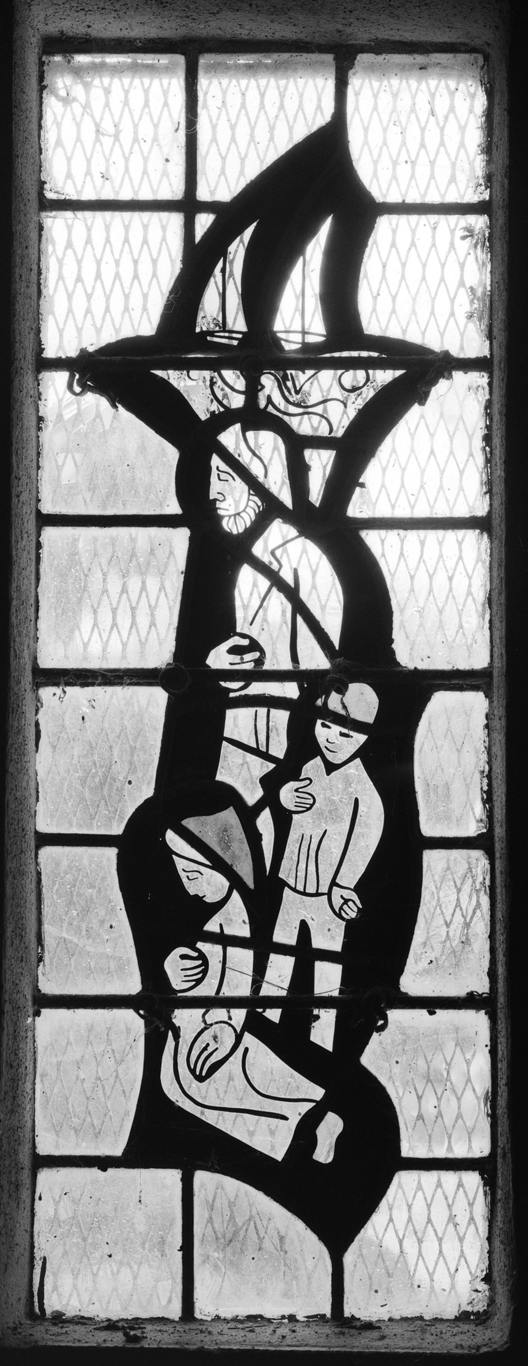 Verrière de la baie 5 : marin, mousse, femme et bateau (état en 1987)Immatriculation
