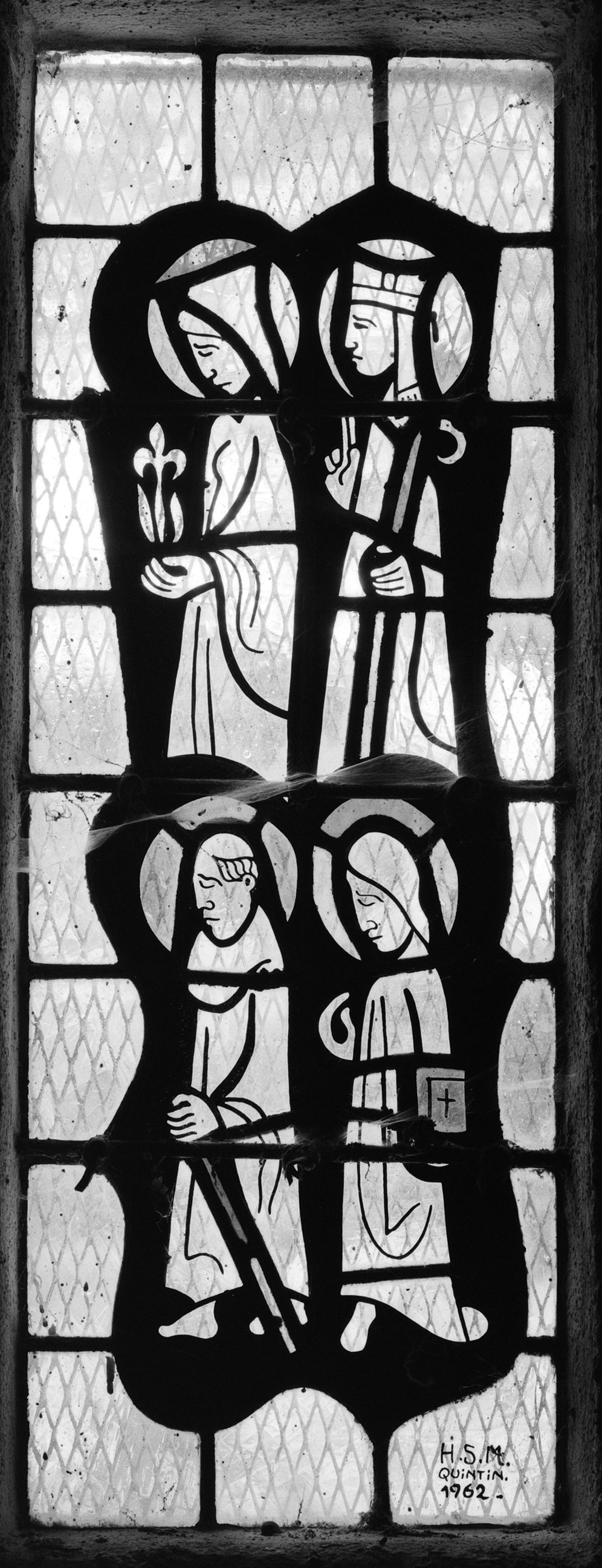 Verrière de la baie 7 : moine, évêque, pélerin et évangéliste (état en 1987)Immatriculation