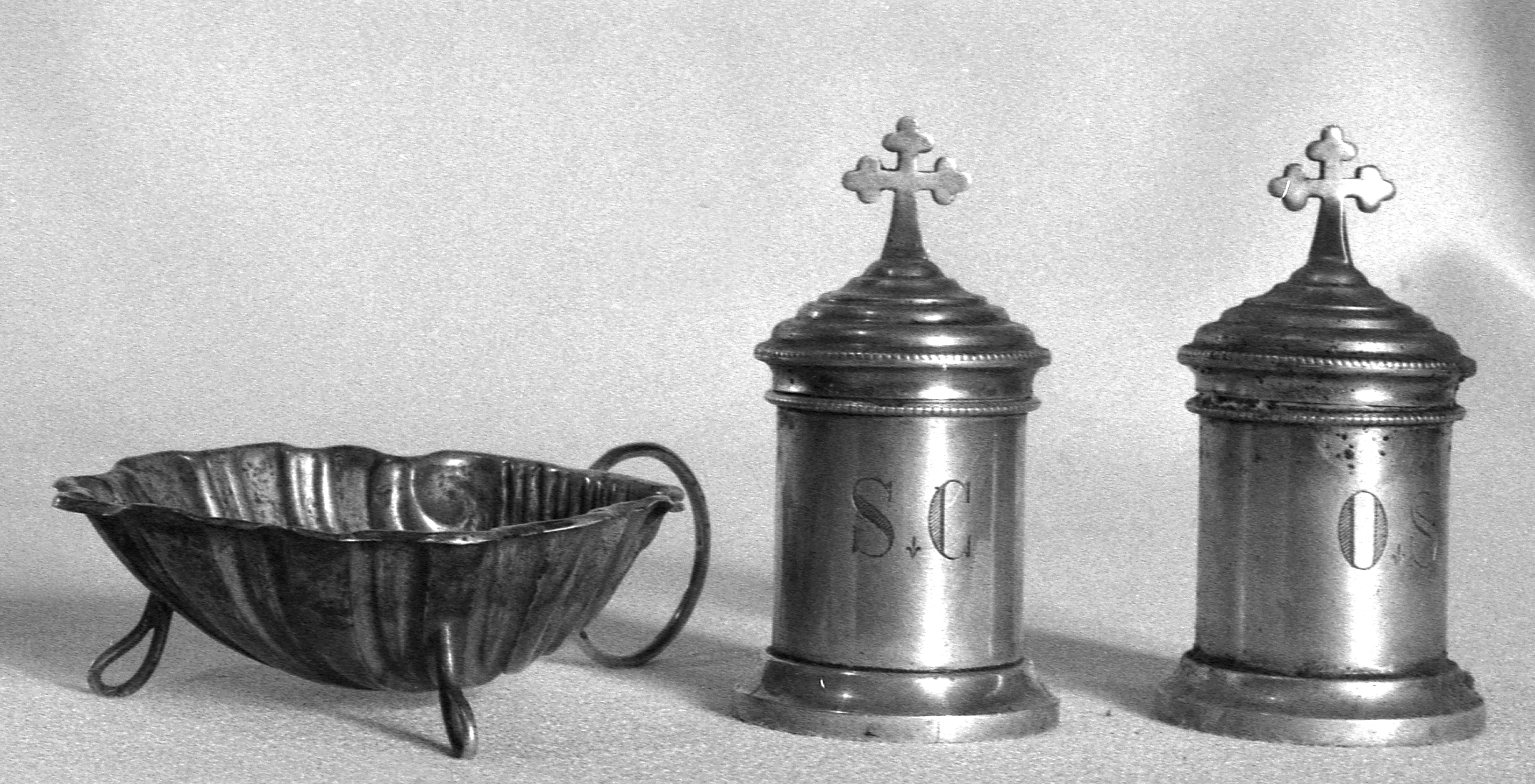 Coquille de baptême et ampoules à sainte huile (état en 1987)Immatriculation