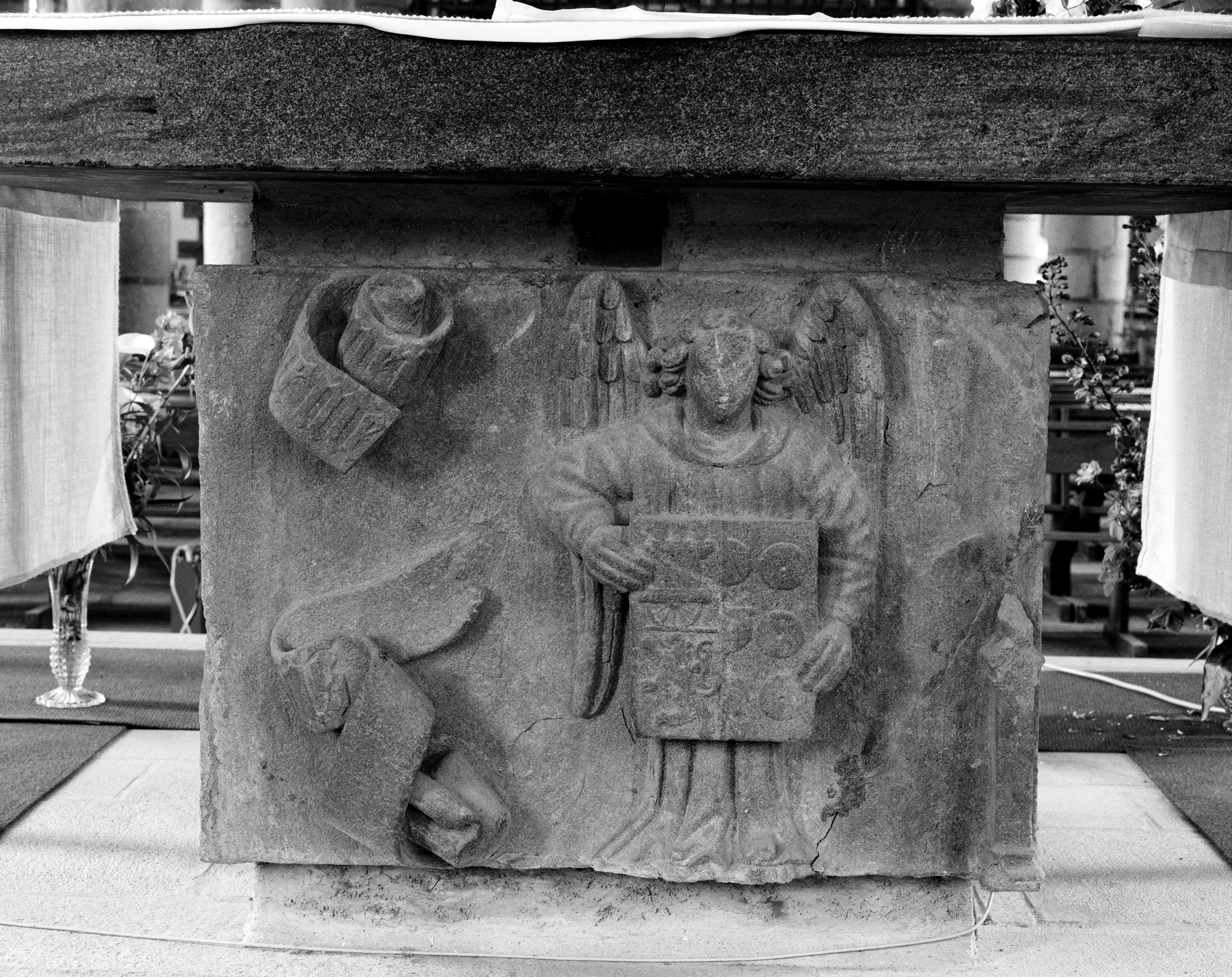 Cénotaphe : sur la face est de l'autel un ange porte les armoiries de la famille de Carman et Pennaneac’h (état en 1987)Immatriculation