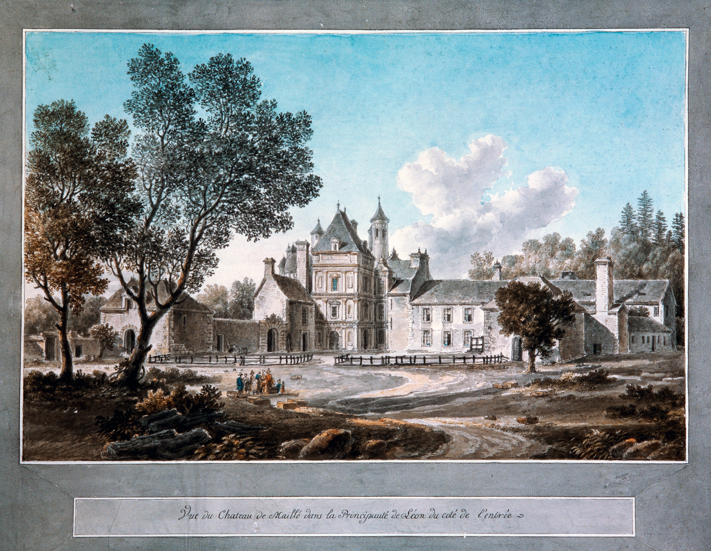 Vue du château de Maillé dans la Principauté de Léon du côté de l’entrée. [s. n., s. d., fin 18e siècle]. Dessin sur papier, plume, aquarelle.
