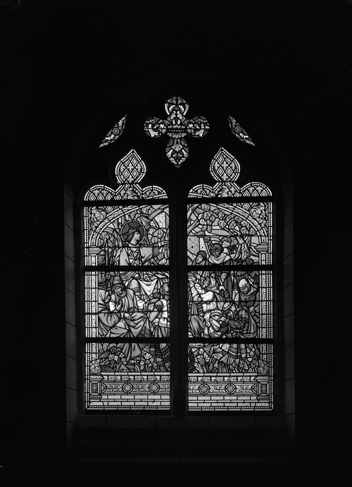 Verrières (3) (verrière figurée) : Résurrection, Saint Louis rend la justice sous un chêne, Jésus bénit les enfants (baies 6, 8, 9), église paroissiale Saint-Martin (Balazé),