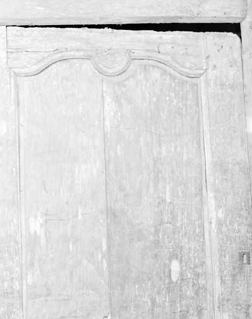 Premier étage, détail du haut d'une porte sur le palier.Immatriculation