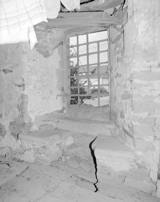 Premier étage, intérieur : détail de la fenêtre à coussiège.Immatriculation