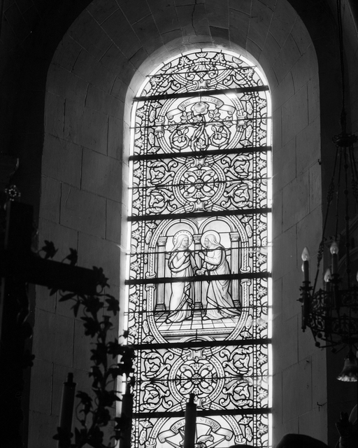 Verrières (3) (maîtresse-vitre, verrière à personnages) : Assomption, Annonciation, Visitation (baies 0 à 2), église paroissiale Saint-Ouen (La Chapelle-Erbrée),