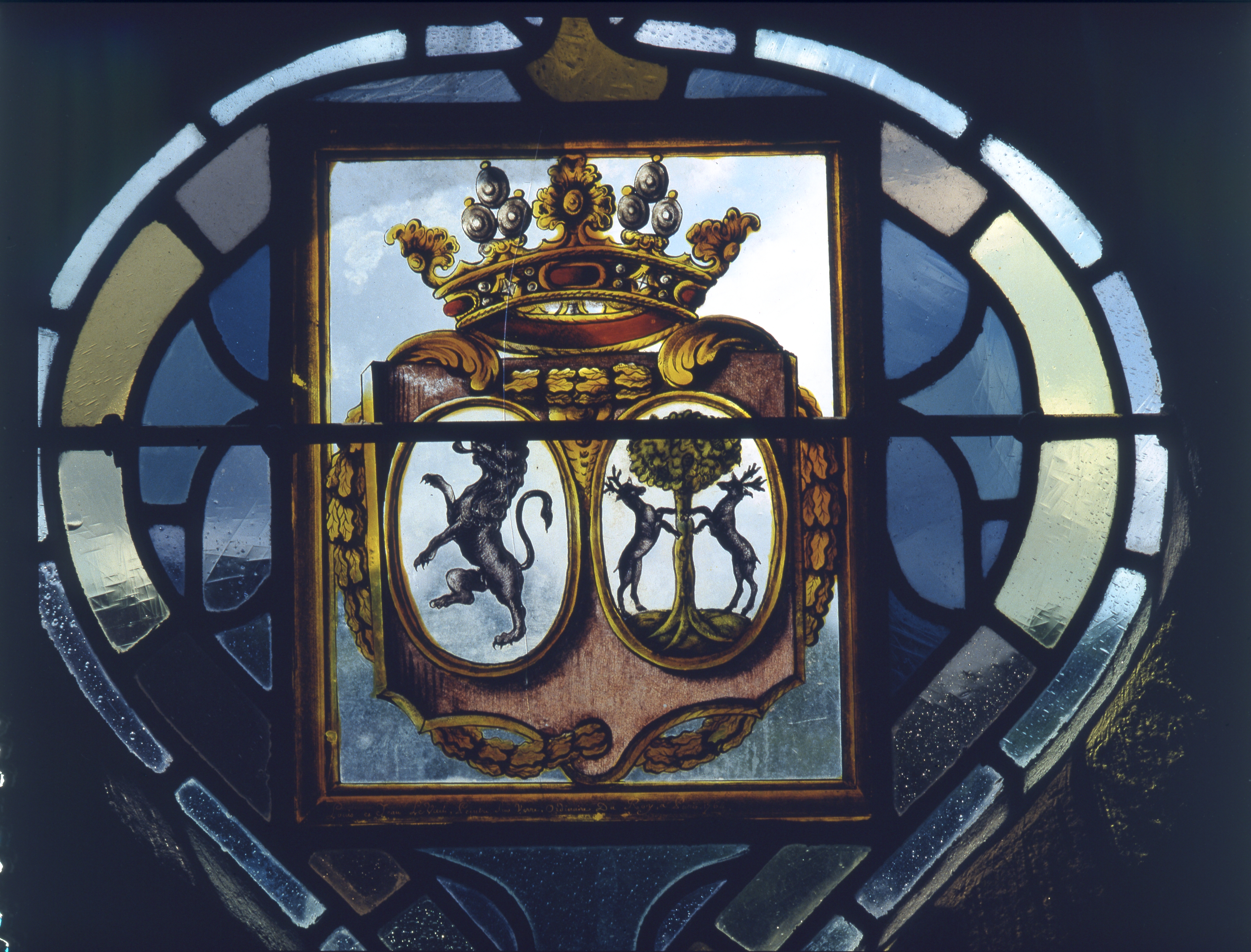 Chapelle domestique, vitrail avec inscriptionImmatriculation