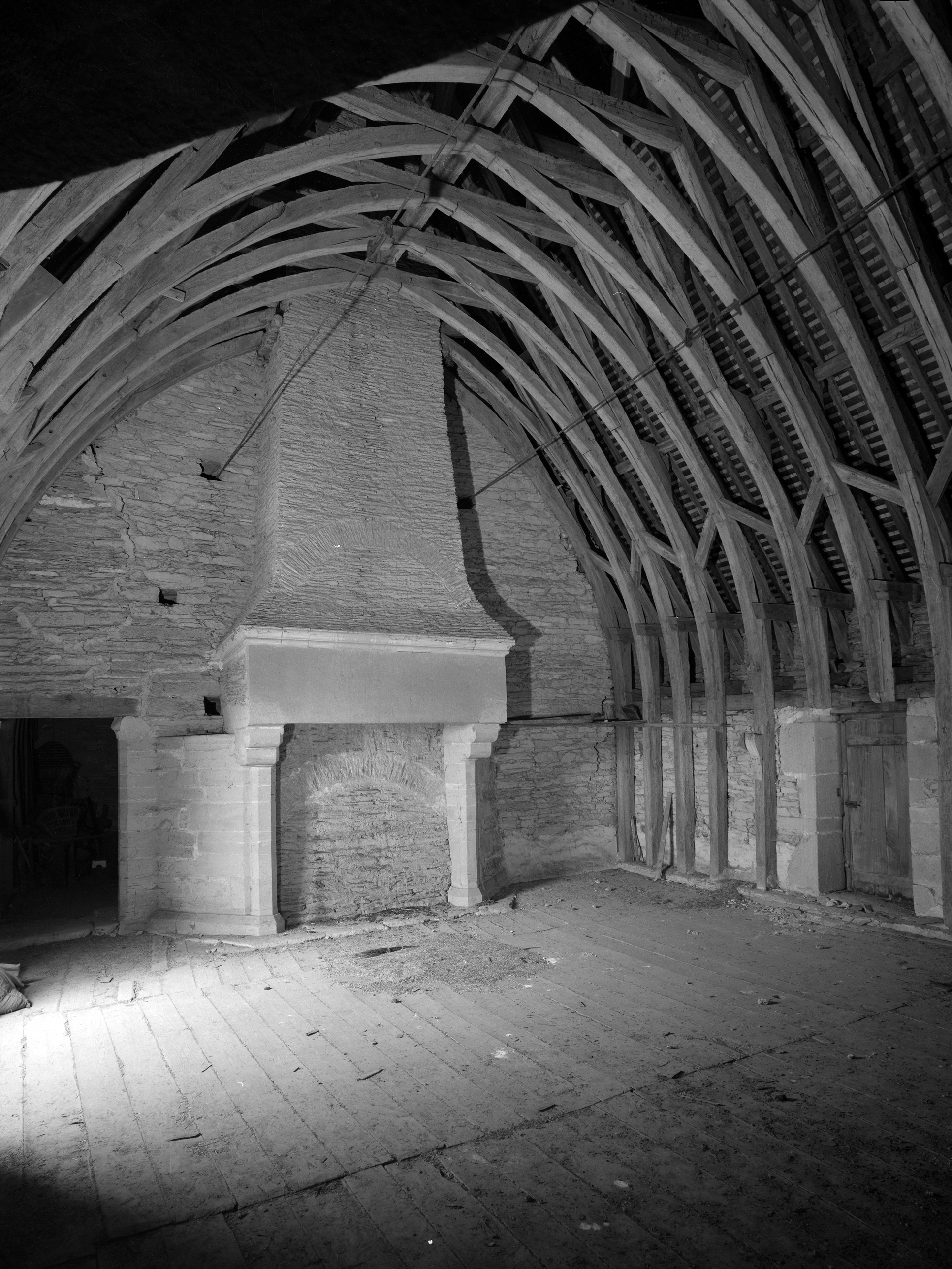 Manoir, logis, étage de comble, pièce sud : vue générale vers la cheminée montrant la charpente (état en 1988)Immatriculation