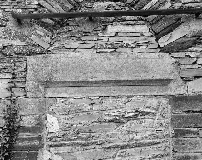 Manoir, dépendances, élévation est, porte en remploi, bouchée : linteau mouluré (état en 1988)Immatriculation