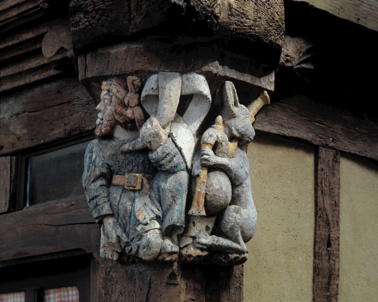 Angle sud-ouest, rez-de-chaussée, décor de l'aisselier du poteau cornier : homme jouant du cor et lièvre jouant de la cornemuse (état en 1988)Immatriculation