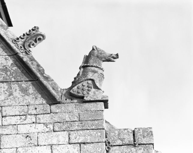 Église, élévation ouest, pignon sud : la crossette porte les armoiries de la famille de Malestroit (état en 1988) ; le cimier en forme de hure de sanglier est la marque personnelle d'un chevalier de la branche de Malestroit-KaërImmatriculation