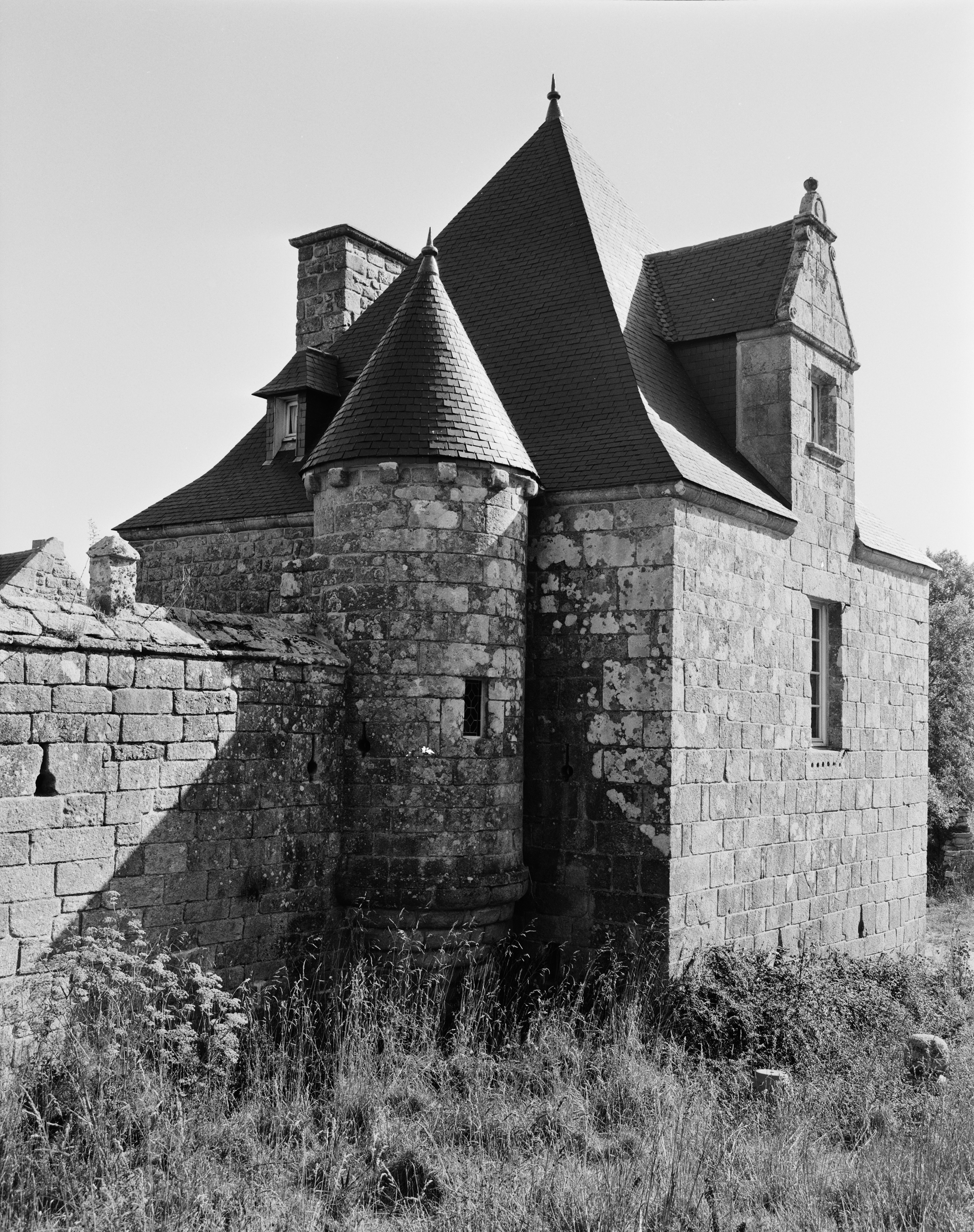 Angle sud-est, pavillon et échauguette, vue sud-ouest prise de l'extérieur de la cour. (1989)Immatriculation