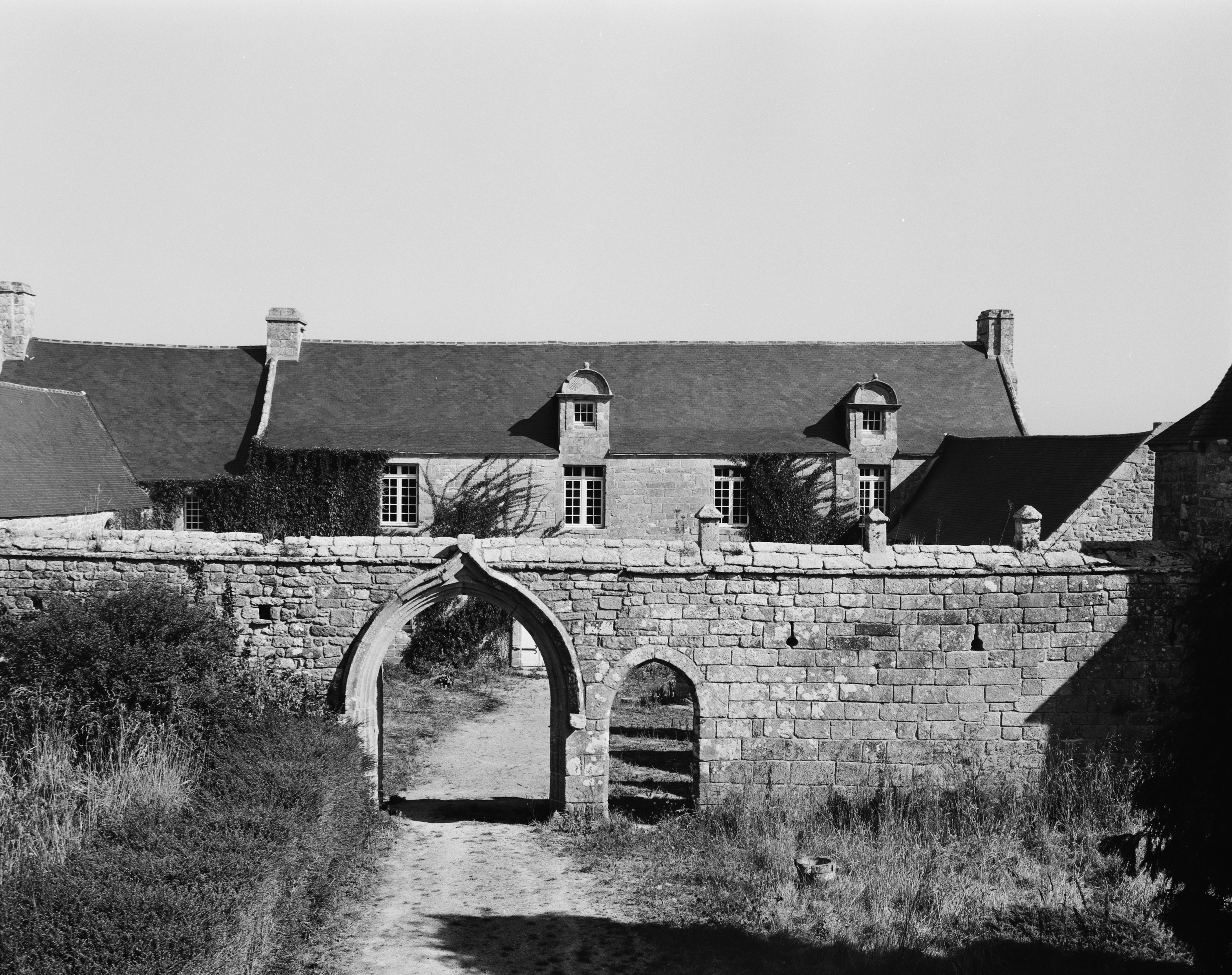 Vue générale sud prise de l'extérieur de la cour, mur défensif et logis. (1989)Immatriculation