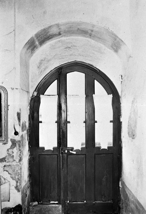 Manoir, logis, rez-de-chaussée, aile nord : porte d'entrée en arc brisé de la salle (état en 1989)Immatriculation