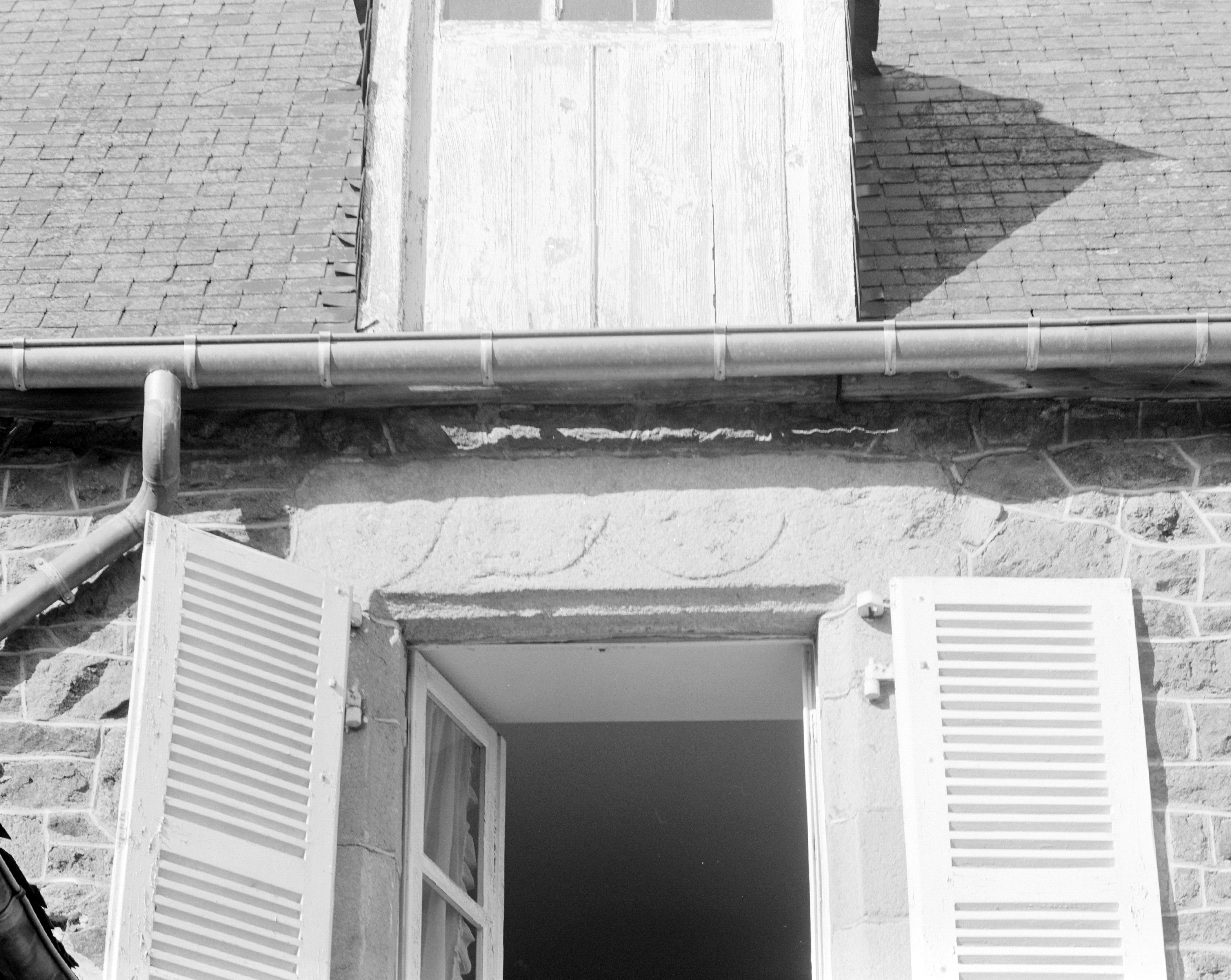 Fenêtre de la chambre de l'étage, détail du linteau sculpté d'une triple accoladeImmatriculation