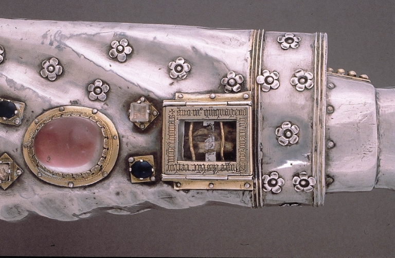 Bras reliquaire, premier quart 15e siècle et 1540 (classé M.H.). Argent sur âme de bois, cabochon de cristal et fausses pierres. Détail de l'inscription autour de la fenêtre supérieureImmatriculation