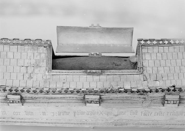 Plougras, le bourg : église paroissiale Saint-Pierre. Châsse reliquaire, détail de la partie centrale, toit ouvert, photographie de 1990Immatriculation