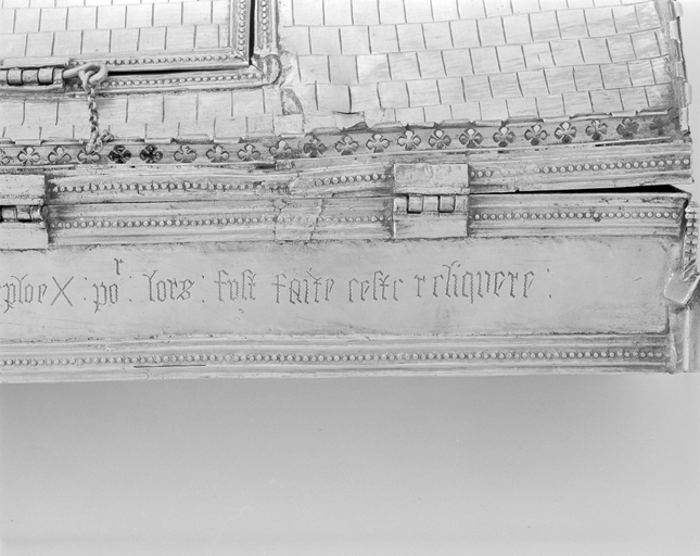 Plougras, le bourg : église paroissiale Saint-Pierre. Châsse reliquaire, détail de l'inscription, photographie de 1990Immatriculation