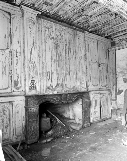 Logis, rez-de-chaussée, salle ouest, cheminée, lambris et placards (état en 1990)Immatriculation