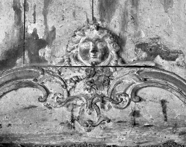 Logis, rez-de-chaussée, salle ouest, cheminée, détail sculpté (état en 1990)Immatriculation