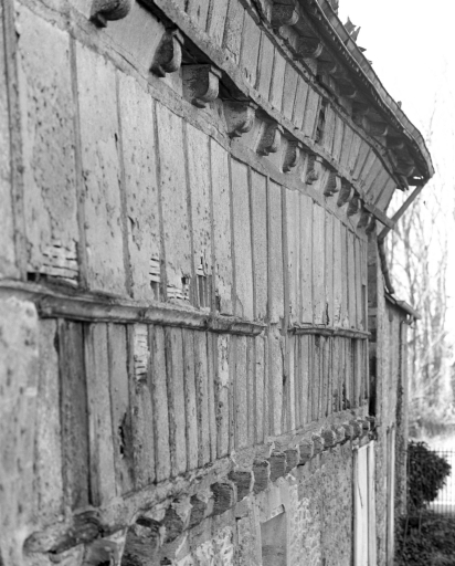 Communs, élévation nord, partie supérieure, détail de la mise en oeuvre des matériaux (état en 1990)Immatriculation