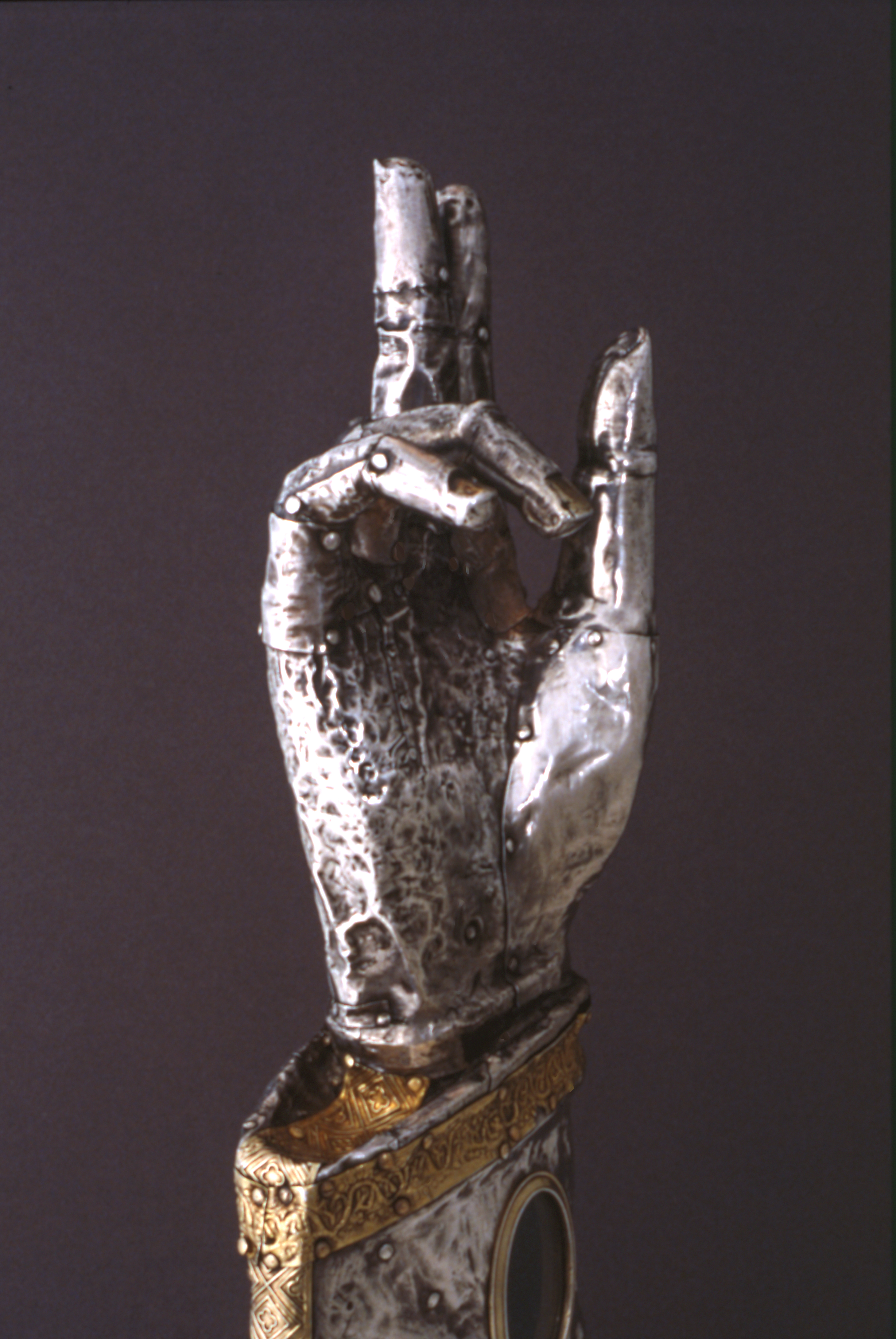Bras-reliquaire : la main vue de trois-quarts, du côté de la paume (état en 1990)Immatriculation