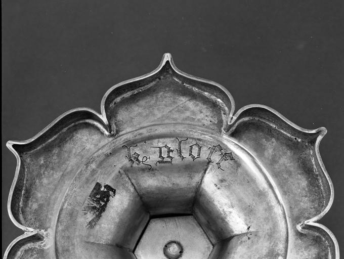 Eglise paroissiale Saint-Trémeur : calice et patène, calice, détail de l'inscription sous le piedImmatriculation