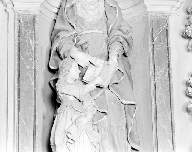 Groupe sculpté Sainte-Anne + Vierge, détail de la tête de la Vierge.Immatriculation