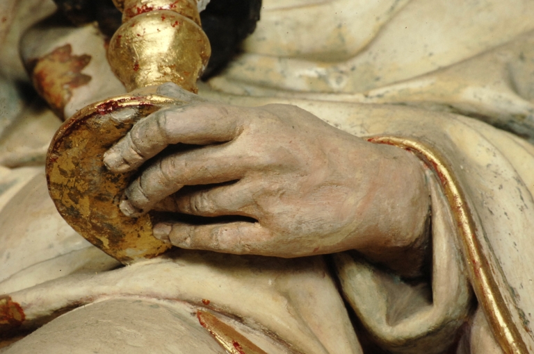 Statue de Saint-Jean Evangéliste, détail main gauche.Immatriculation