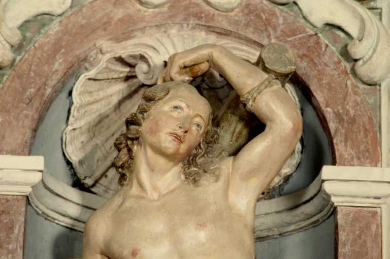Détail tête et bras gauche levé de de Saint-Sébastien retable Nord.Immatriculation