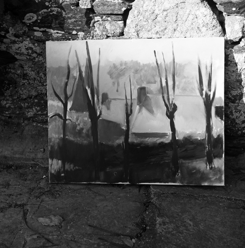 Château (loca : A/36), tableau : Paysage (maison, arbres, toits de Rochefort-en-Terre pris de la rabine d'accès au château)Immatriculation