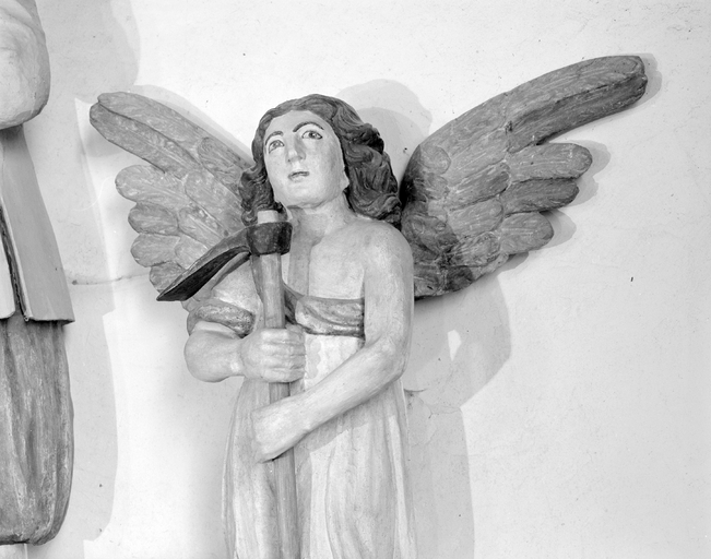 Le Vieux-Marché, les Sept Saints : chapelle, vue intérieure, détail du buste de l'ange portant la houe verticalementImmatriculation