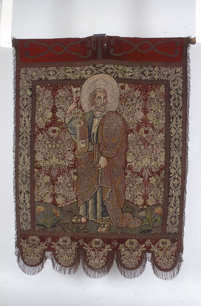 Bannière de procession Christ entre la Vierge et saint Jean, saint Pierre (Minihy-Tréguier),