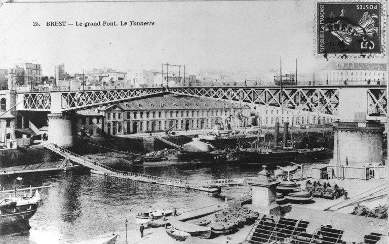 Vue de l'arsenal de Brest et du pont tournant (fermé). En arrière-plan : le quartier de Recouvrance. Le Tonnerre. Carte postaleImmatriculation