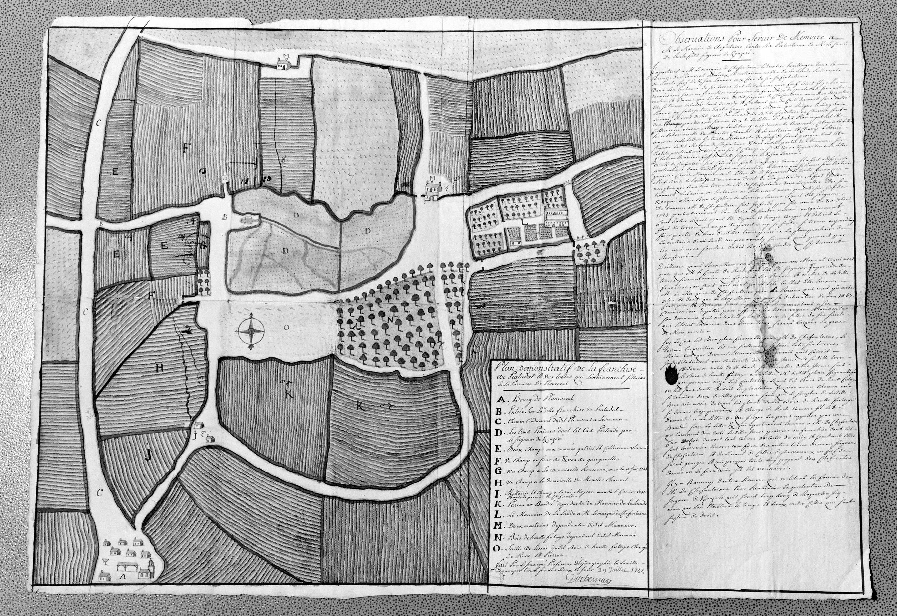 Manoir, Pratudal : plan démonstratif de la franchise de Pratudal et des terres qui l'environnent, 1754 (A. D. Finistère)Immatriculation