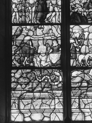 Verrière à personnages de la baie 3 : Paradis terrestre ; Enfance du Christ ; Baptême du Christ,