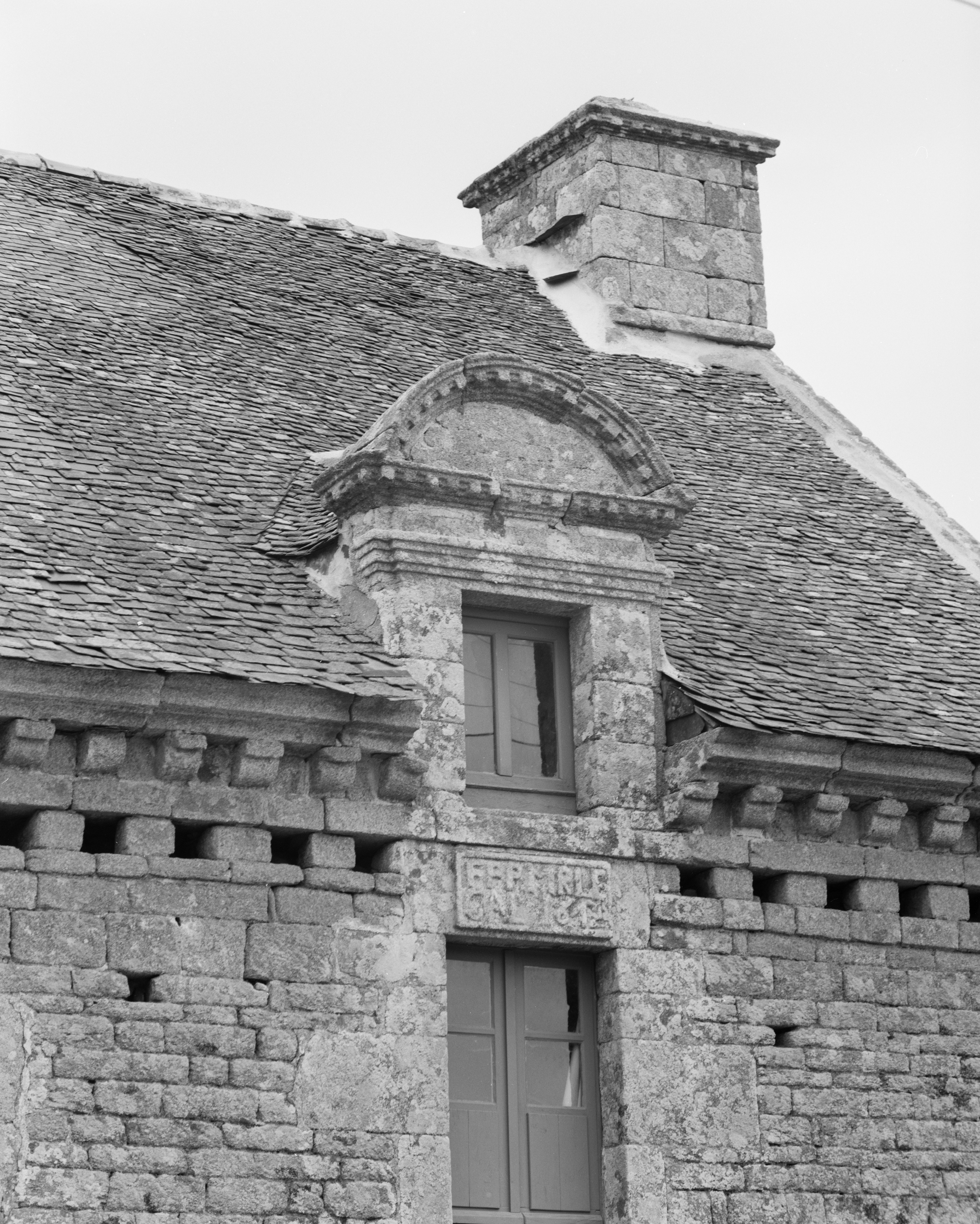 Maison, élévation sud : lucarne et inscription (état en 1991)Immatriculation