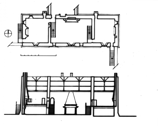 Restitution de l'état du 15e siècle : plan à l'étage et coupe longitudinaleImmatriculation