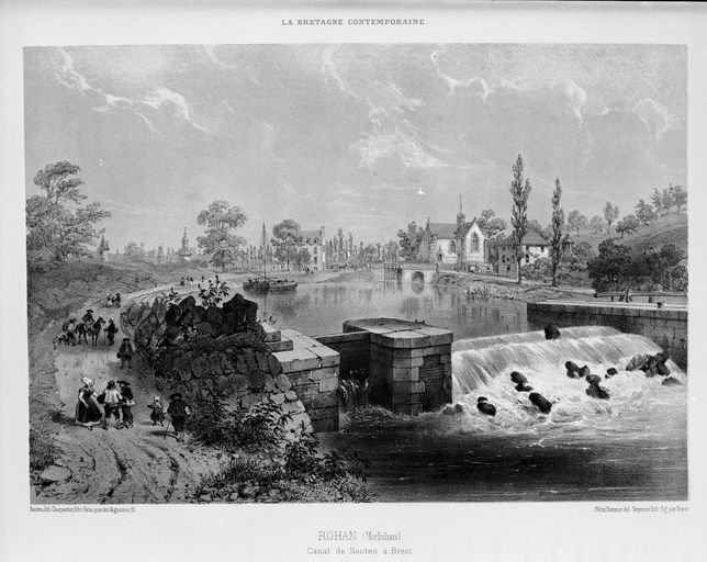 ' ROHAN (Morbihan). Canal de Nantes à Brest ' : vue générale de l'écluse depuis l'aval (gravure, 1865)Immatriculation