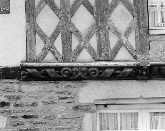 Maison : sablière inférieure, décor de la partie gauche : masque et rubans (état en 1992)Immatriculation