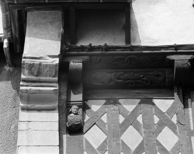 Maison, 1er étage, sablière supérieure et poteau gauche, décor : monstres, écus et ange portant un écu (état en 1992)Immatriculation