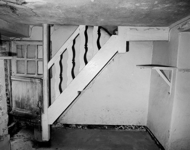 Maison, rez-de-chaussée, pièce ouest : mur nord et escalier (état en 1992)Immatriculation