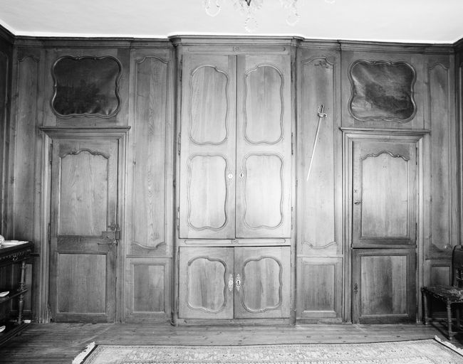 Maison, salle à manger, mur est : lambris et placard d'attache (état en 1992)Immatriculation