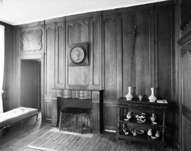 Maison, salle à manger, mur nord : lambris et cheminée (état en 1992)Immatriculation