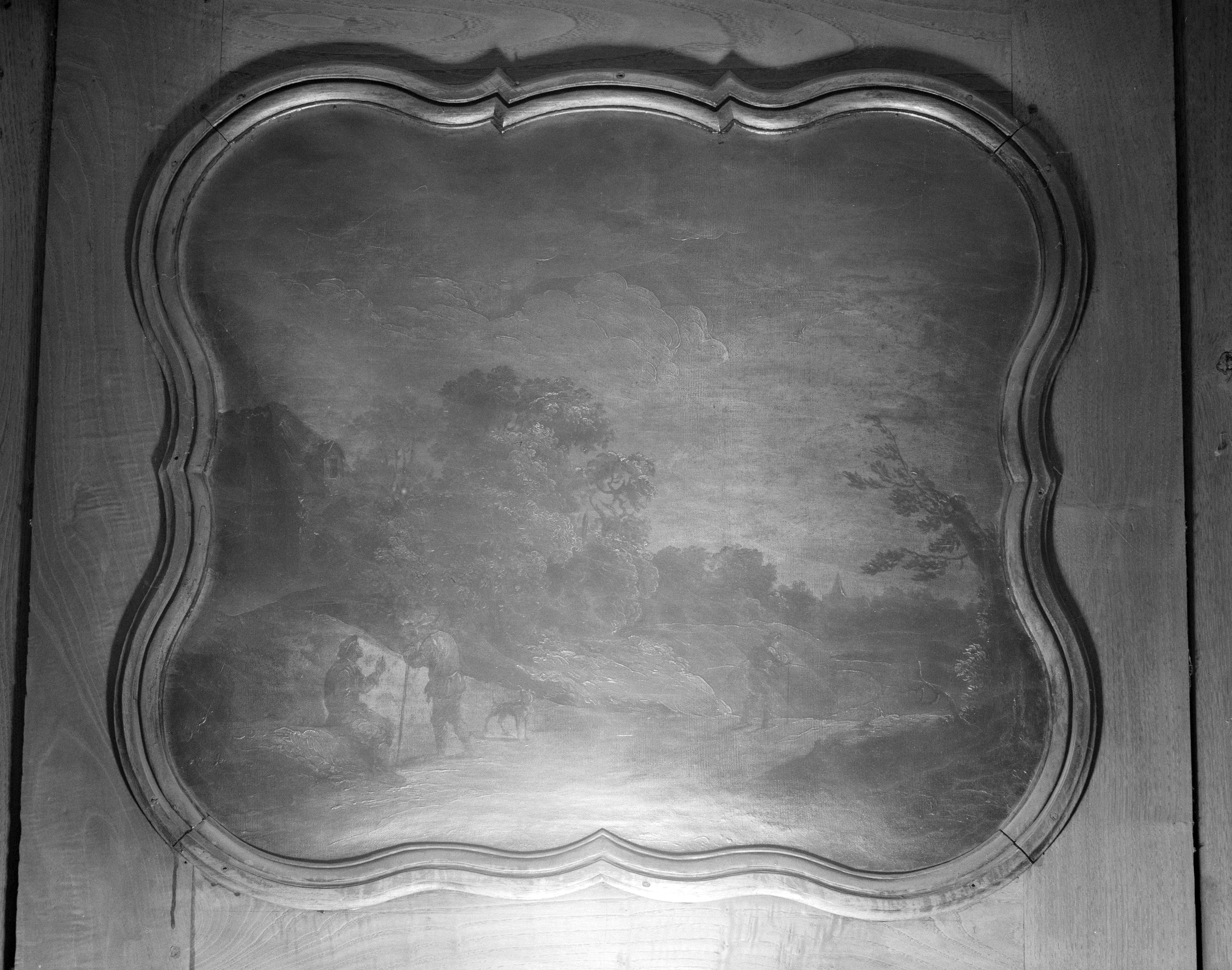 Maison, trumeau : Scène rurale avec trois personnages et un chien (coll. part.)Immatriculation