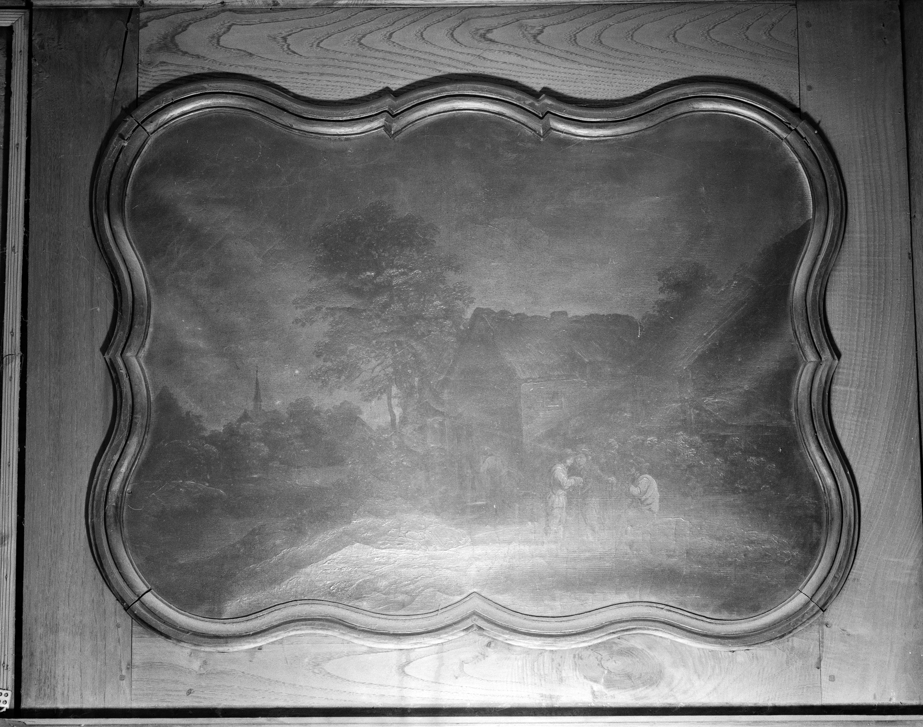 Maison, trumeau : Scène rurale avec trois personnages devant une maison ; église (coll. part.)Immatriculation