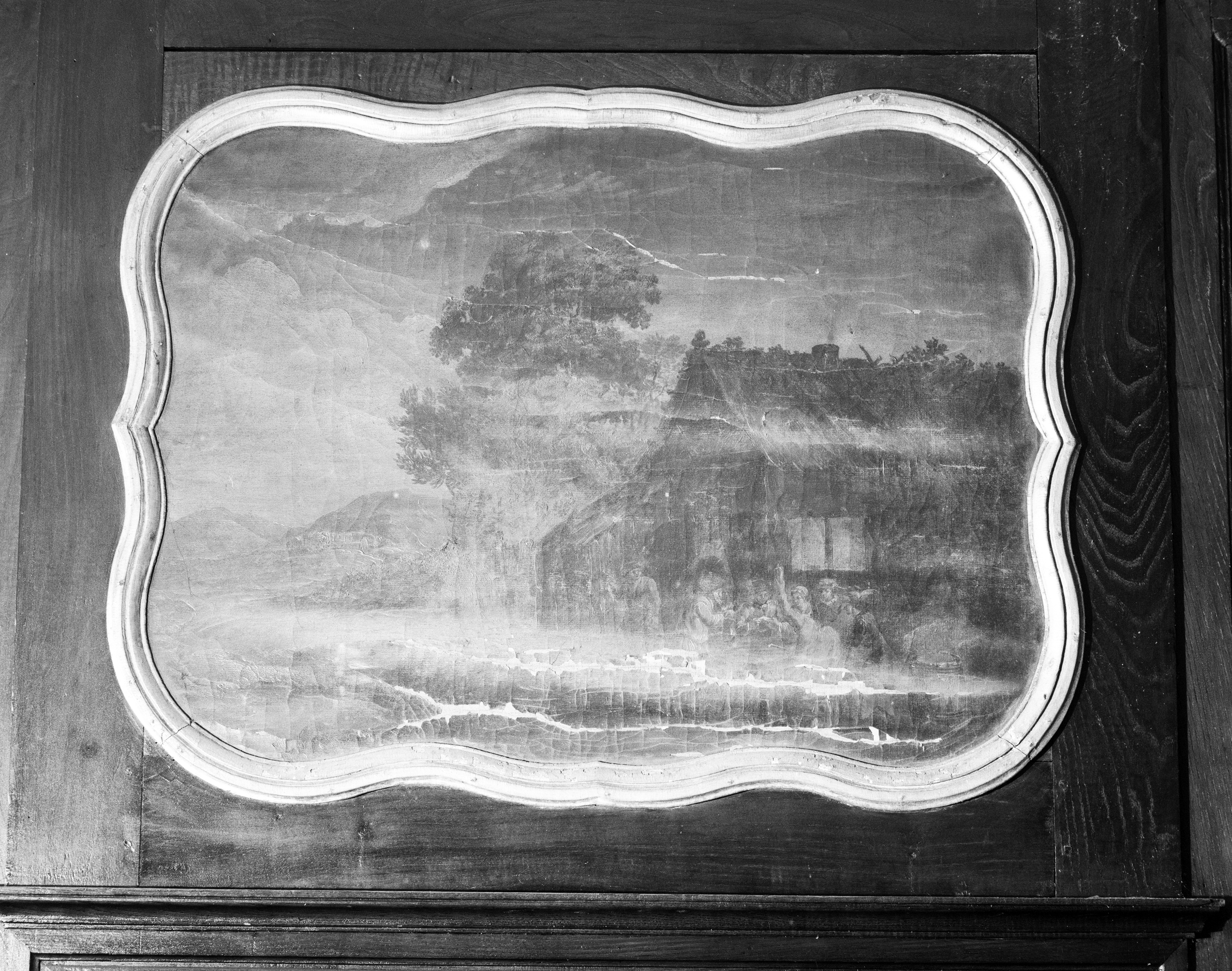 Maison, trumeau : Scène rurale avec sept personnages devant une maison (coll. part.)Immatriculation